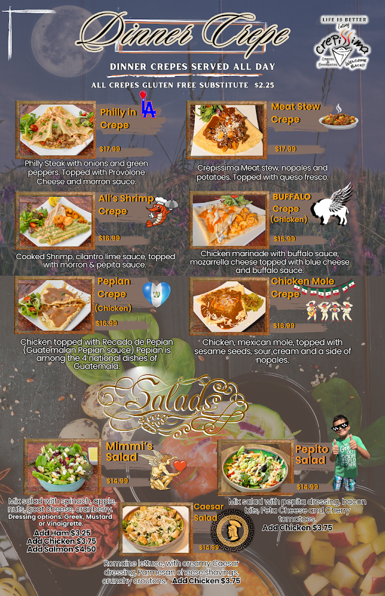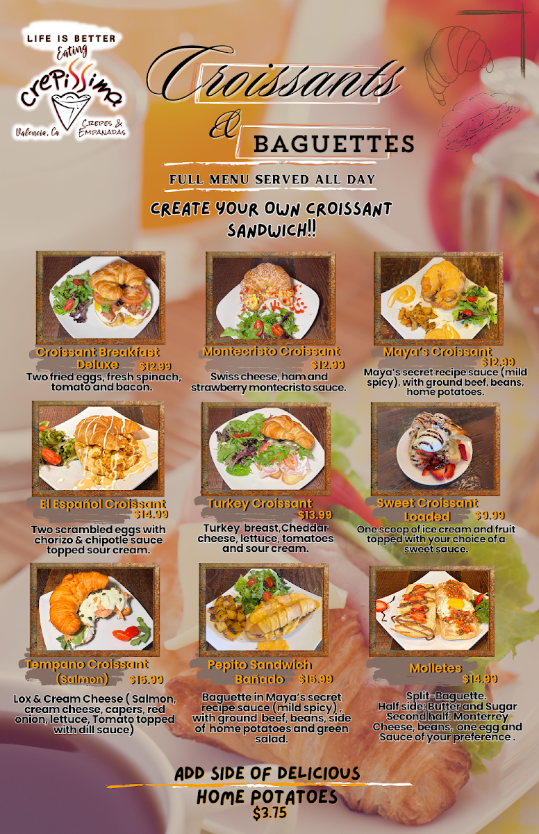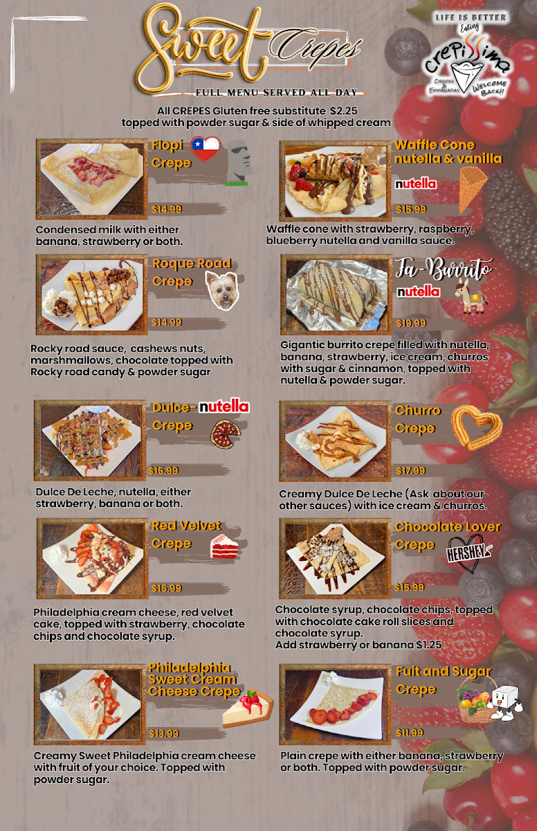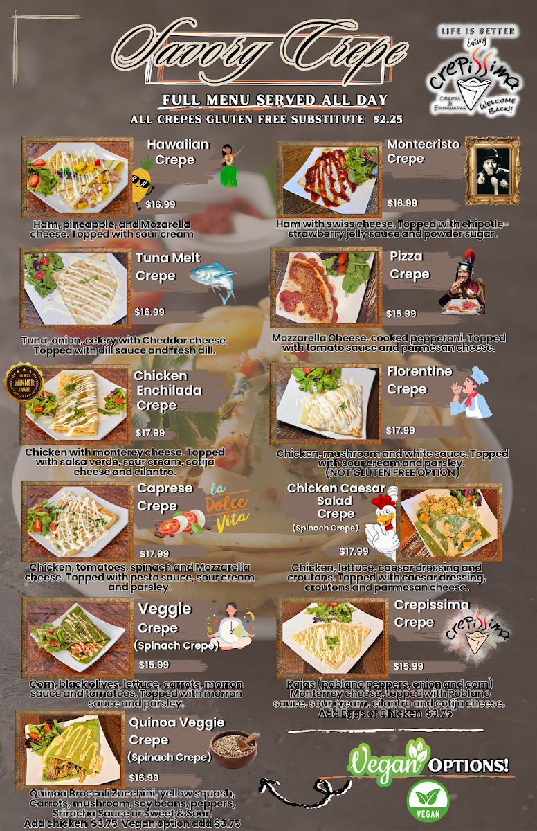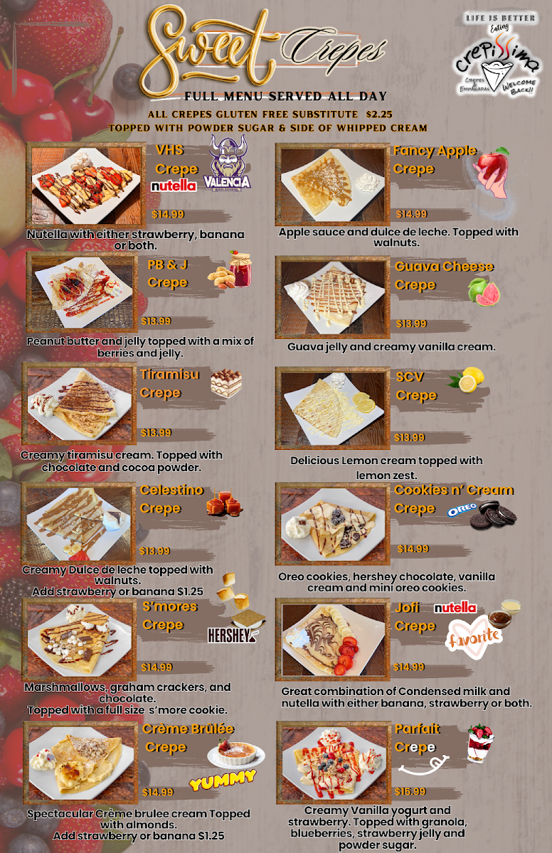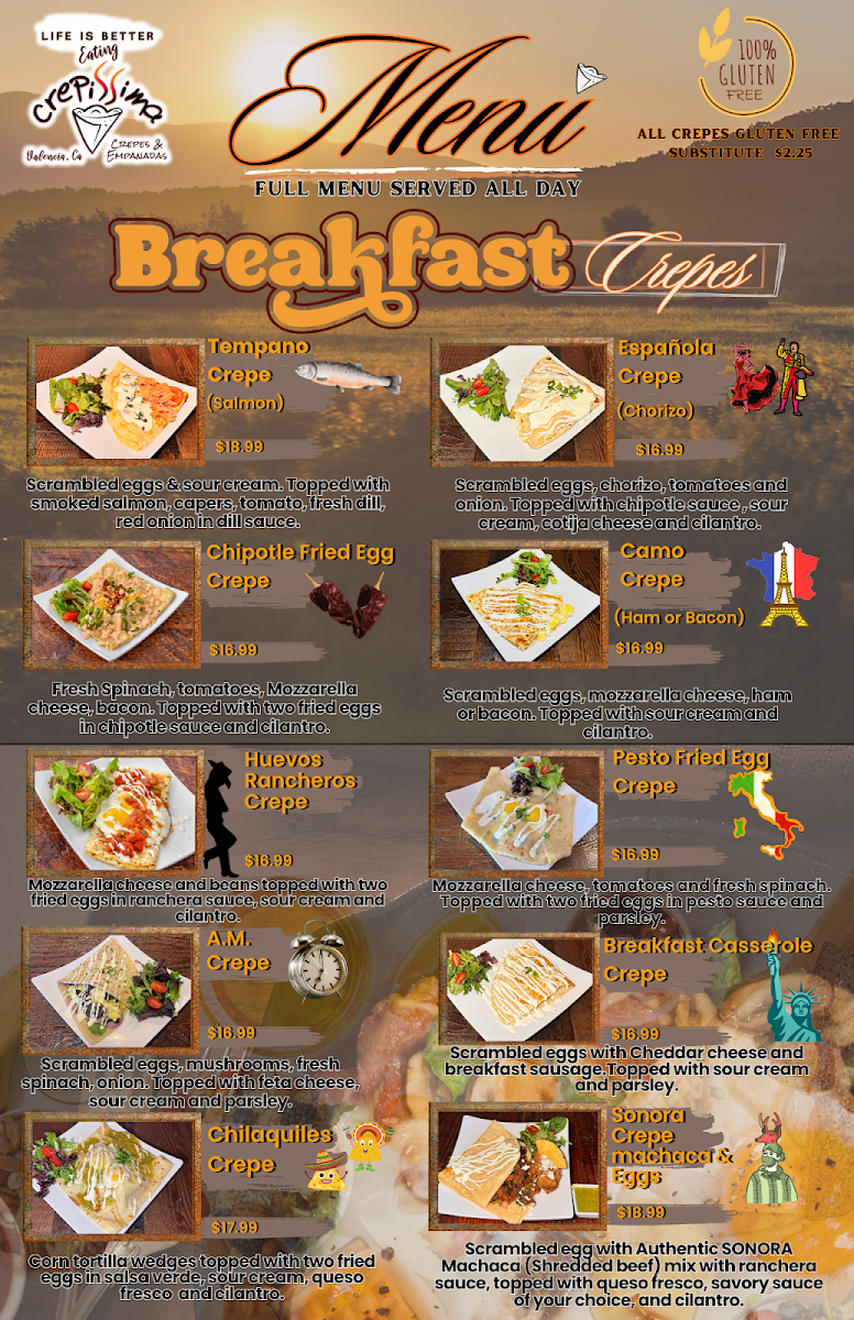 Two crepes, three eggs any style, 1 protein, 1 veggie, 1 sweet sauce of your choice,1 fruit (strawberries or bananas). Side of home potatoes